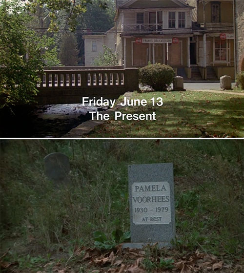 | | 6 | June 13, 1979  | Dates | 20th Century: 70s | Events | | June 13, 1979 Pamela Vorhees murders 9 people, mostly camp counselors in and around Camp Crystal Lake, before final girl Alice Hardy decapitates her with a machete. The title card confirms the month and day, but not the year. The year is confirmed in Part IV, when a group of teenagers on their way to Crystal Lake find Pamela Vorhees' tombstone, with the death year of 1979.